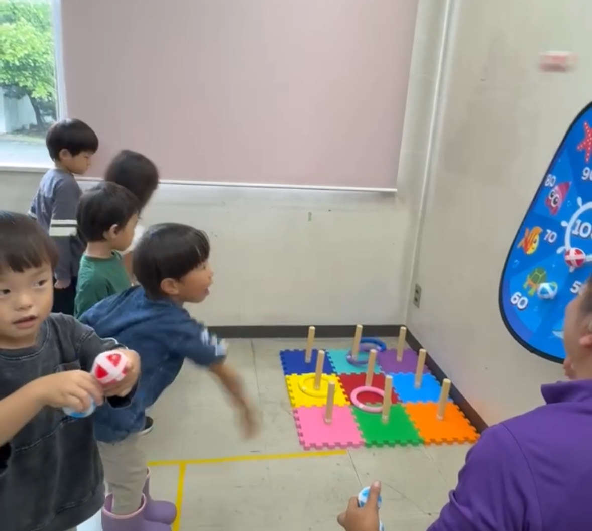 子どもコーナーでは、的当て・輪投げ・缶バッジ作りが大人気!
