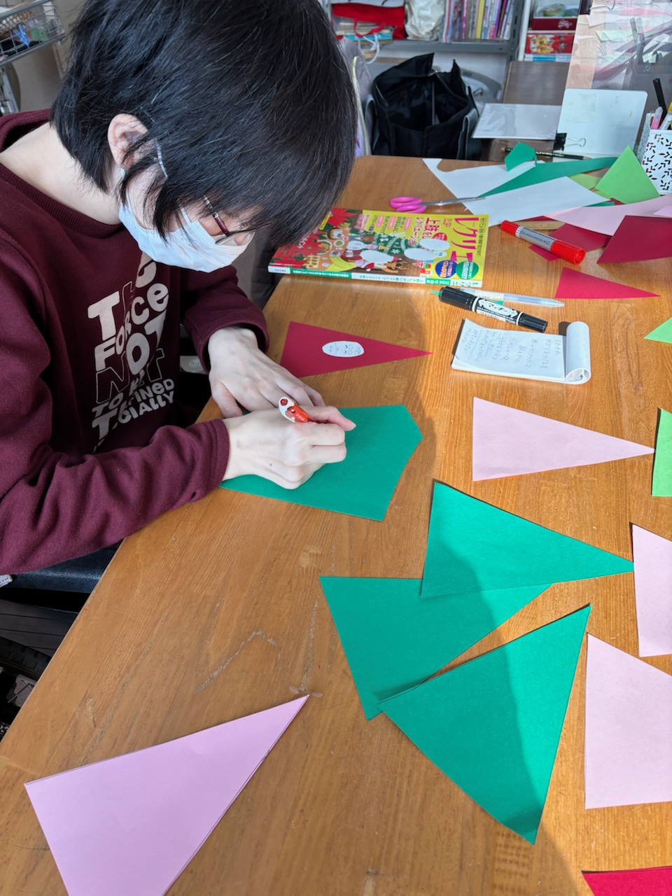 みんながワクワクするこの時期にあわせて、三角形のサンタクロースをたくさん飾ったクリスマスツリーをつくりました。