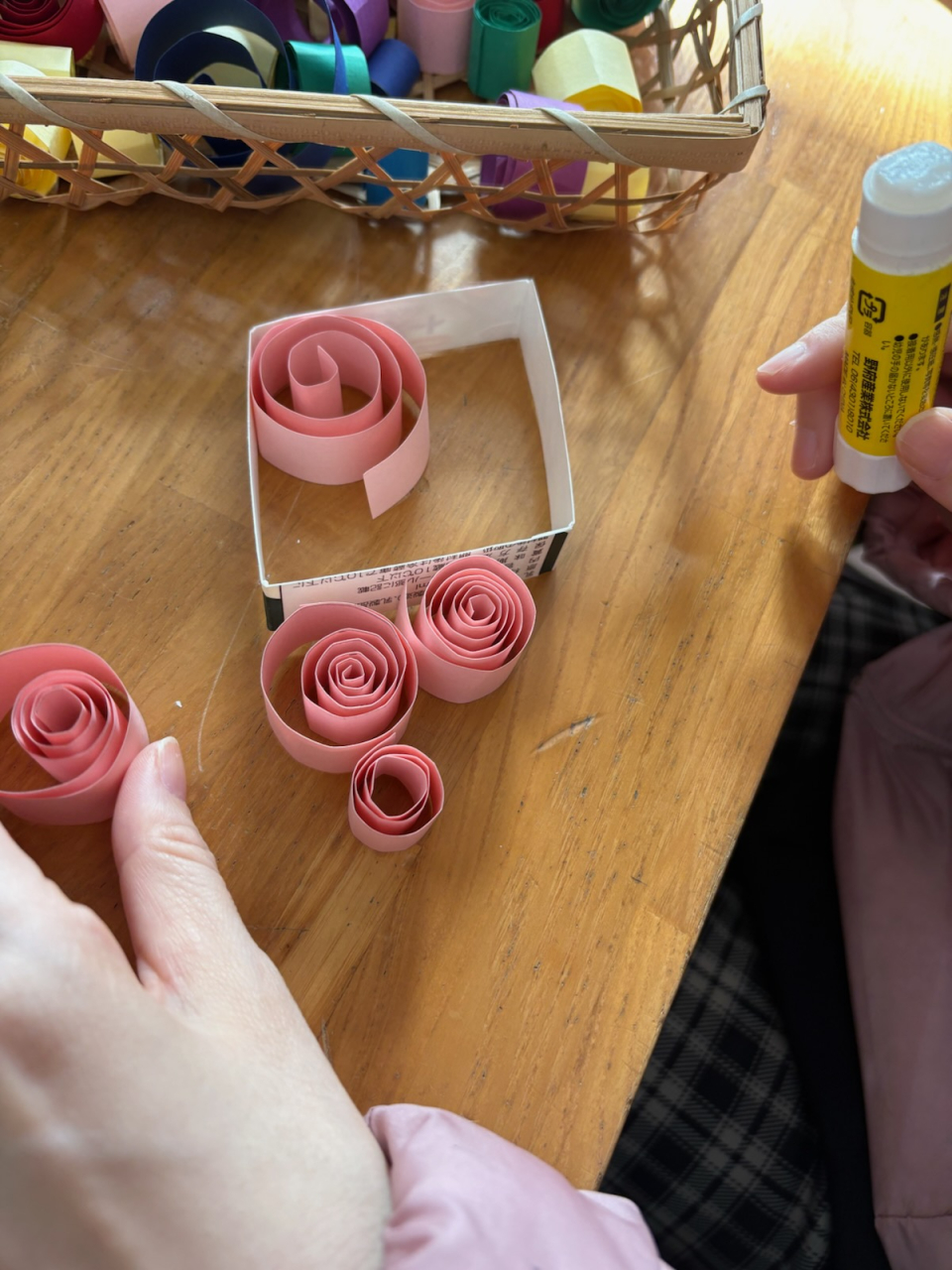 ②できた四角形の内側に以前作った、ペーパークイリング(色画用紙を細長く切って、くるくる巻いた物)を入れて、のりで貼って固定します。