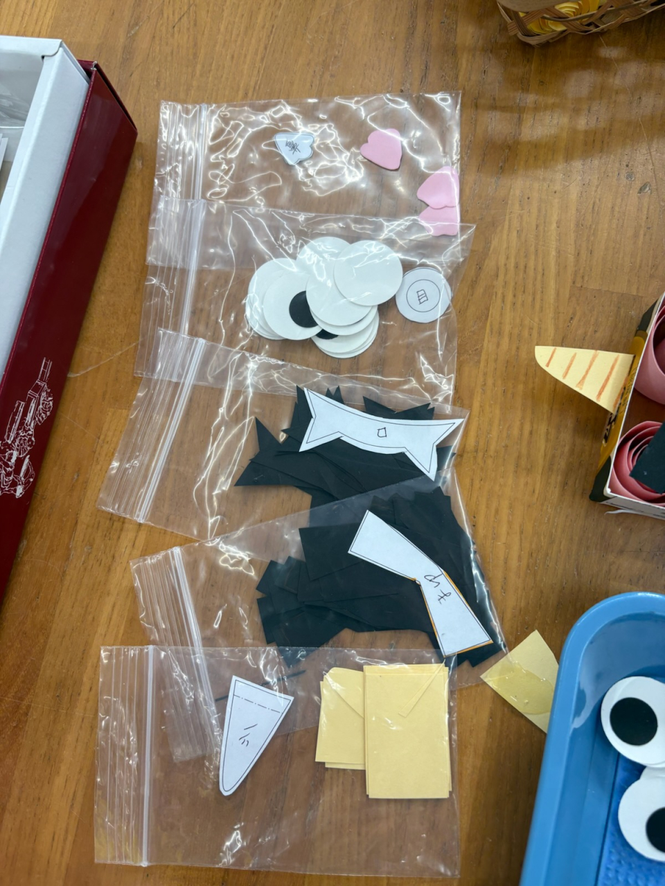 ③職員さんが事前に作ってくれた眉、目、鼻、口、角をペーパークイリングの上に貼りつけて完成です。