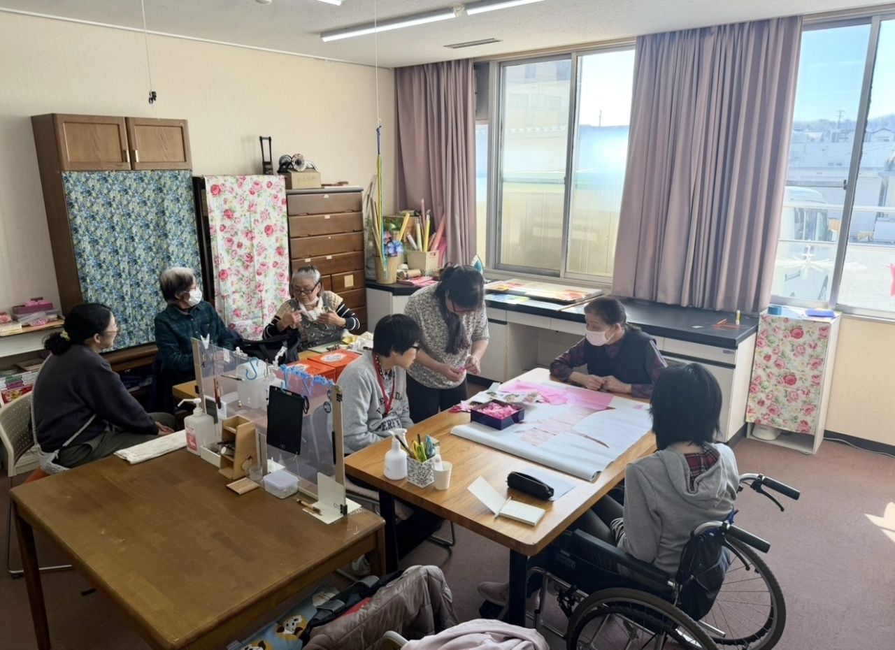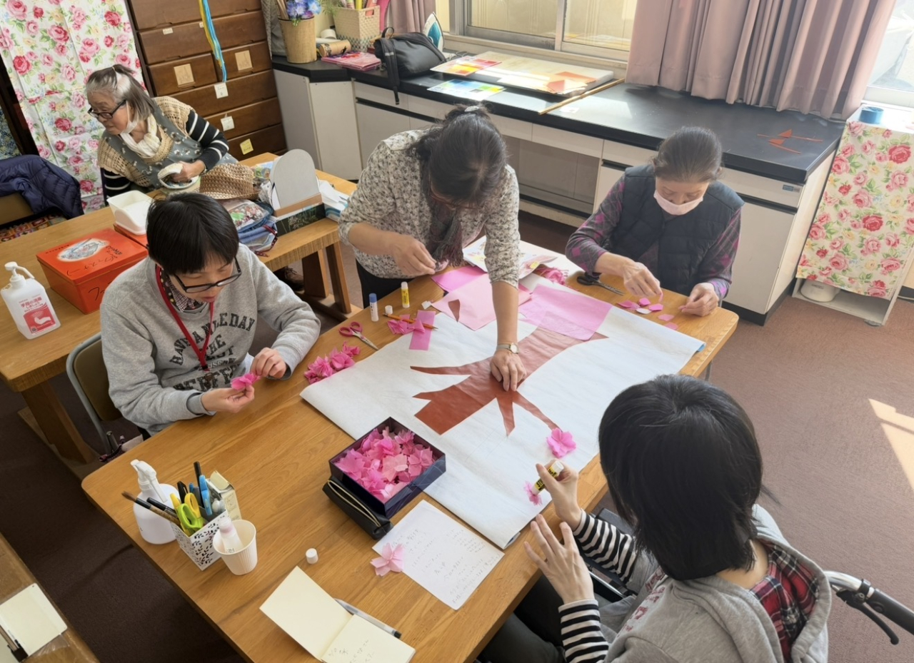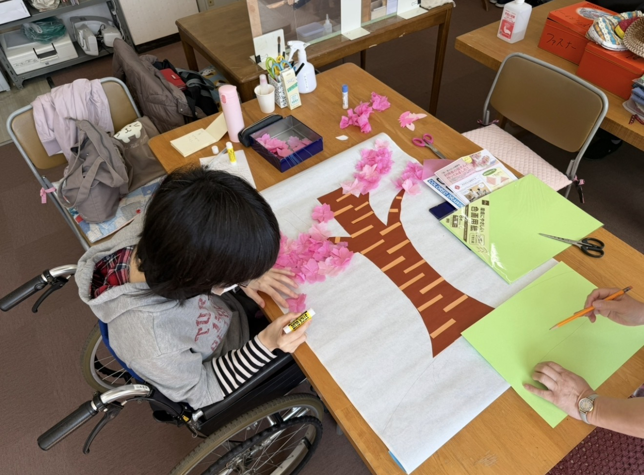 館内でも、利用者様が一つひとつ丁寧に花びらを貼り付けた桜が少しずつ花を咲かせ、満開に近づいています。
